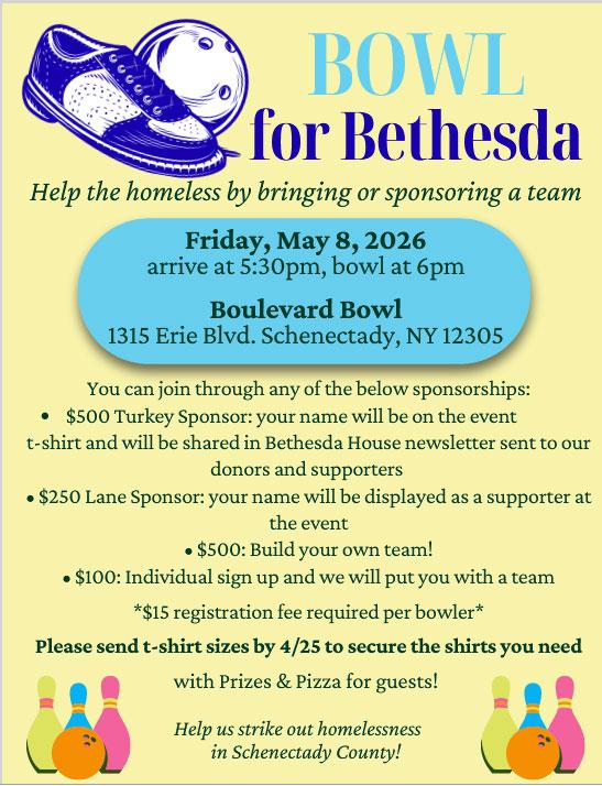 The 2026 Bowl for Bethesda “Strikes to End Homelessness” event is our thirteenth year of providing an evening of fun for bowlers and help for our homeless population in Schenectady County. Every dollar we raise is used for programs that bring a measure of dignity and kindness to our vulnerable citizens.